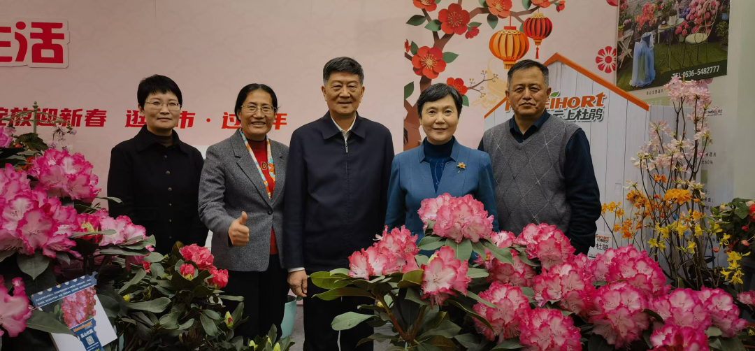 ◇刘红会长(右二)、中国花卉协会赵良平副会长(左二)、北京市园林绿化局副局长林晋文(左一)在展会现场